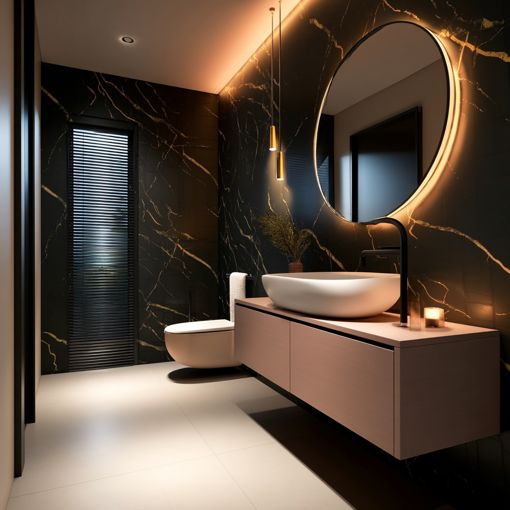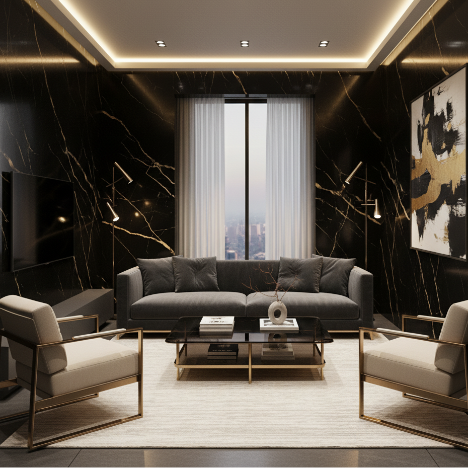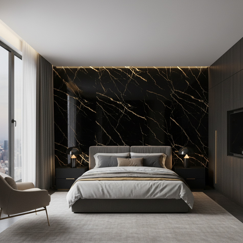 Un panel de alto impacto visual. El fondo oscuro con vetas doradas ofrece una combinación de lujo y modernidad, ideal para proyectos atrevidos que buscan destacar. Ideal para cine walls, baños premium o espacios con iluminación indirecta que resalten sus matices.