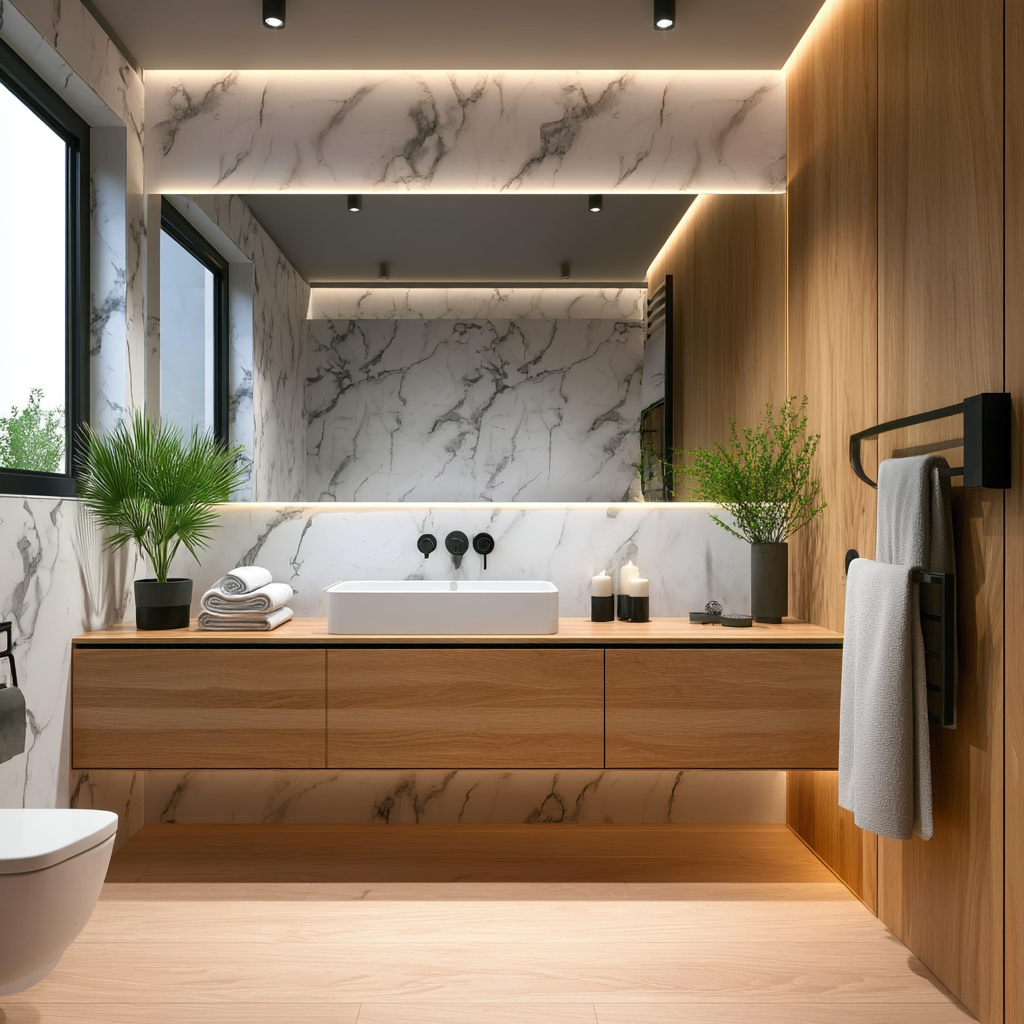 Un clásico que nunca pasa de moda. El Carrara Blanco ofrece un fondo blanco suave con vetas grises delicadas, perfecto para baños y cocinas que buscan una estética limpia y luminosa. Su ligereza y resistencia lo hacen ideal para reformas sin obras.