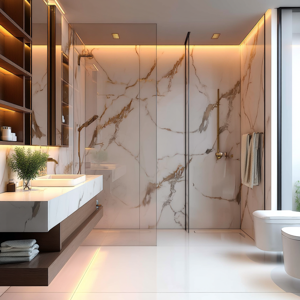 Ligero y fácil de instalar, este panel de PVC es resistente al agua y se adapta a múltiples espacios. Su efecto mármol brillante realza la elegancia de cualquier ambiente.